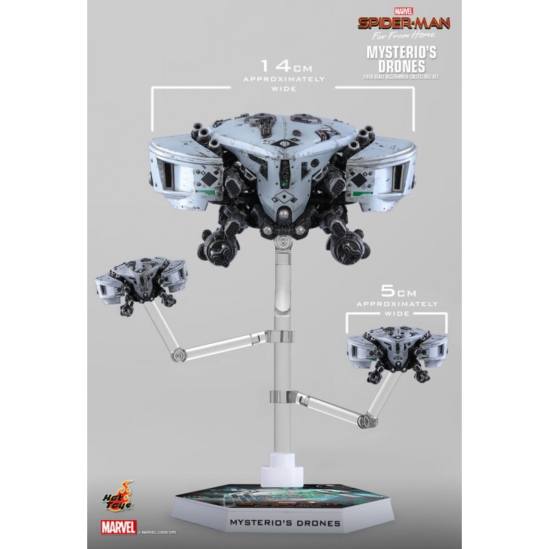 Meticulously crafted with fine attention to details, the drone accessories set features sixth scale Mysterio Drones, measures approximately 14 cm in width, 13 cm in length, and 7.5 cm in height; two miniature drones, measures approximately 5 cm in width, 4.5 cm in length, and 3 cm in height; beautifully painted with battle damage effects and stretches; and a specially designed collectible stand to set up all the drones at the same time.