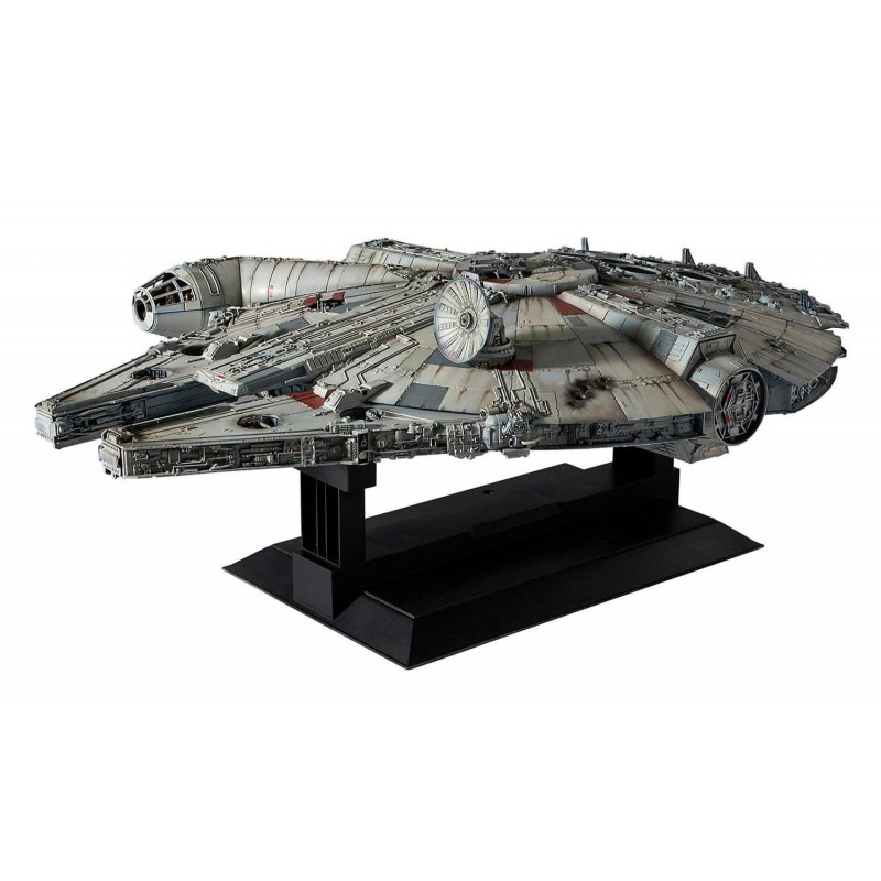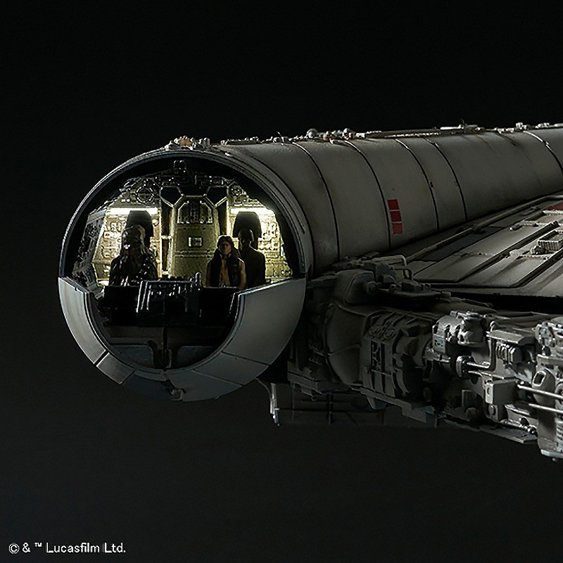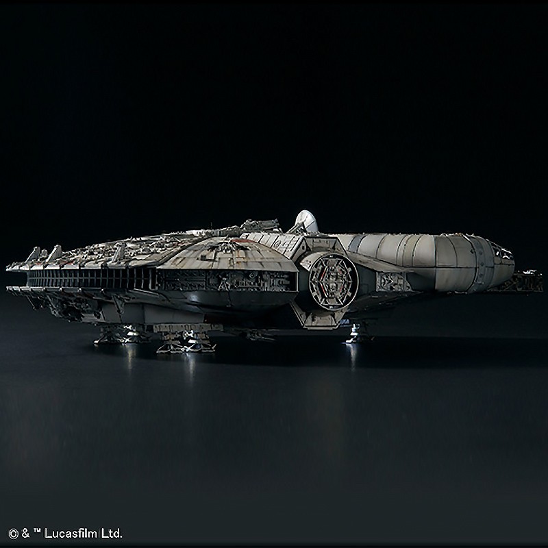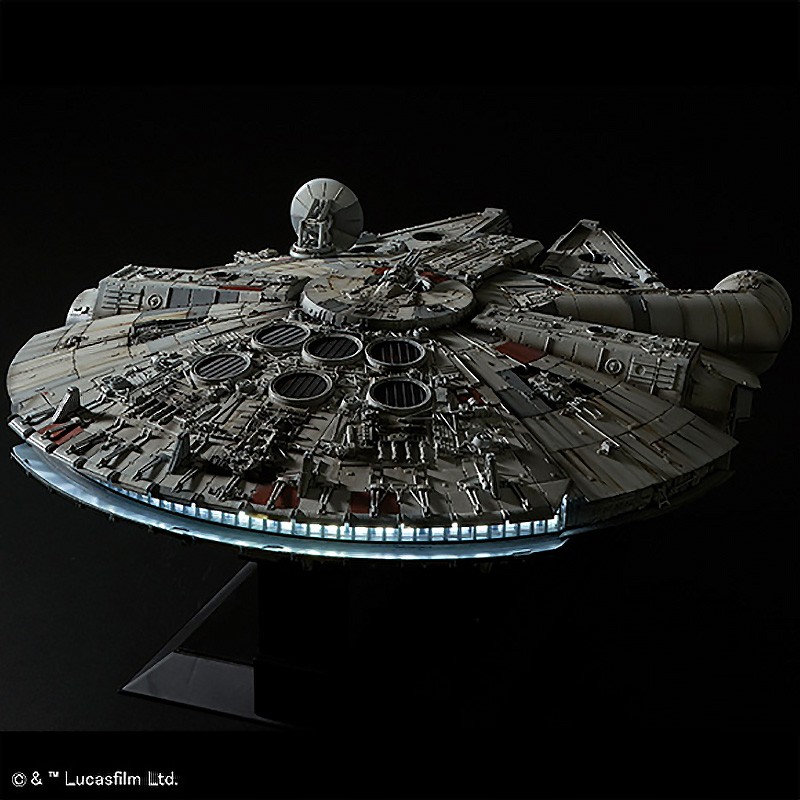 The Millennium Falcon, as seen in the celebrated 1977 first film "Star Wars: A New Hope," joins the "Perfect Grade" series, Bandai's flagship line of ultra-detailed plastic model kits. Designed with total accuracy in mind, the kit is based on extensive research of the 1.7 million studio model used in the film. It features various LED light-up functions and comes with 6 figures, as well as a display stand and decals.
