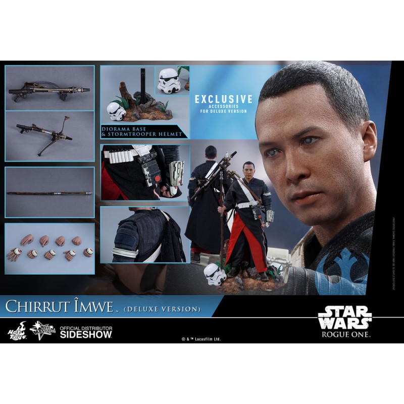 En celebración del famoso actor de Hong Kong y artista marcial Donnie Yen protagonizada por el guerrero espiritual Chirrut, Hot Toys se complace en presentar una versión especial Deluxe de la sexta escala Chirrut Îmwe sólo disponible en mercados seleccionados. Esta figura de colección extremadamente viva está especialmente diseñada sobre la base de la apariencia del personaje en la película, con una escultura de cabeza recién desarrollada, un traje meticulosamente hecho a medida, armas detalladas y accesorios, incluyendo un bastón y una ballesta.