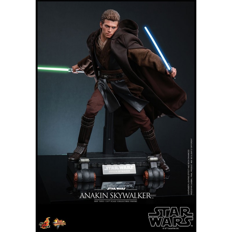 Basada en la apariencia de Anakin Skywalker en la película, la figura coleccionable de sexta escala desarrollada meticulosamente presenta una cabeza esculpida recientemente con una semejanza asombrosa y una función de globo ocular giratorio que permite posicionar la línea de los ojos, una túnica y una túnica Jedi hábilmente confeccionadas, un brazo derecho mecánico intercambiable, dos sables de luz con luces LED, un soporte de exhibición con temática de la fábrica Geonosian™ y un empaque conmemorativo de diseño especial.