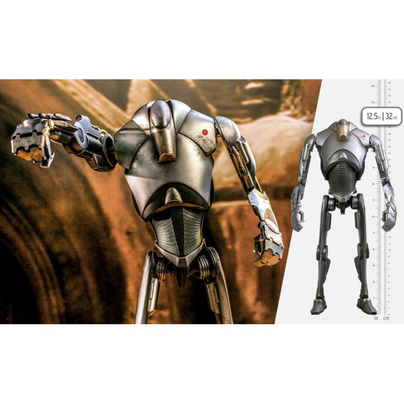La figura coleccionable a escala 1/6 del Super Battle Droid se basa en su apariencia en la batalla de la arena Geonosis™. La figura de Star Wars presenta una estructura mecánica recientemente desarrollada con impresionantes aplicaciones de pintura metálica, una amplia gama de articulaciones y un soporte de exhibición con temática de arena.